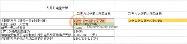 購買紅路燈的時候配置的兩塊50w的光伏面板,由于安裝角度不能都隨著太陽入射角度而變化,評估轉換效率為80%,加上充電器的效率約85%,而且紅路燈安放的位置為多棟20多層高樓中間,每天都要在中午十二點以后才有陽光曬到面板進行發電,下午四點左右又被遮擋了,所以一天的發電量為50w*2*0.8*0.85*4=272wh.