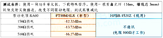 總結:遠距離且光纖縮線芯條件下,安華高HFBR-1521Z需較大的電流才工作,飛爾康FT10MHLR較小工作電流穩定工作,電源功耗低。