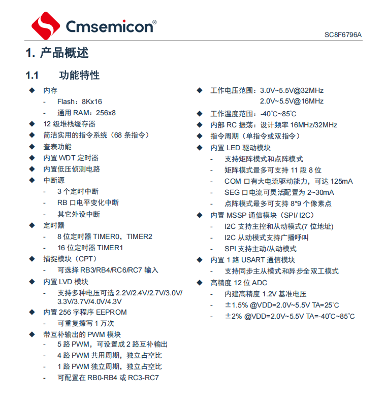 SC8F6796A內置UART、MSSP(SPI/I2C)、12位ADC模塊,支持LED驅動
