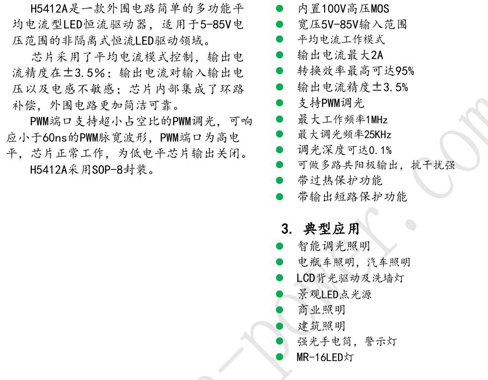 惠海小煒一、概述H5412A 作為一款高精度降壓型 LED 恒流驅動芯片,采用平均電流控制模式打造,同時內置 100V 高壓 MOS 管,其設計定位明確指向 5-85V 寬電壓范圍的非隔離式 LED 驅動場景。在性能表現上,該芯片借助獨特的環路補償技術,搭配 ±3.5% 的精準電流控制能力,能夠實現最高 2A 的穩定輸出電流,尤其適配對驅動精度、穩定性有高要求的照明系統,可充分滿足這類場景下的恒流驅動需求。