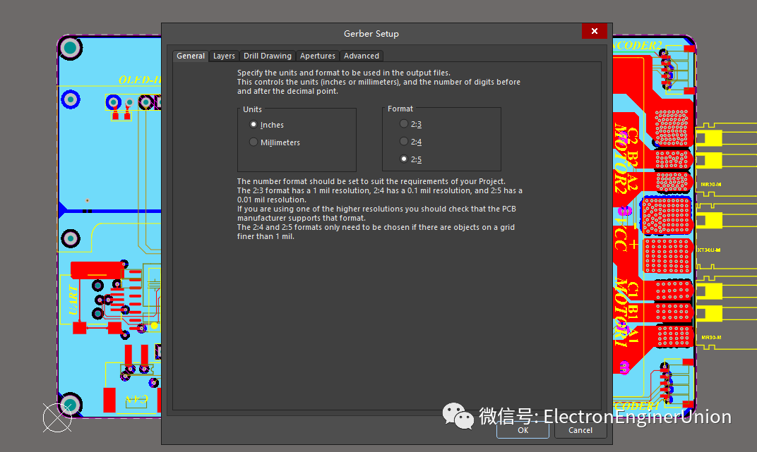 在PCB的文件環境中,左鍵點擊file->Fabrication outputs->Gerber Files 。進入Gerber Setup 界面。在"General"選項中,"Units"選擇inches,"Format"選擇2:5。這個的尺寸精度比較高。如下圖所示: