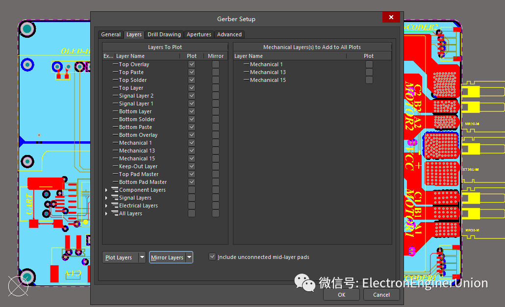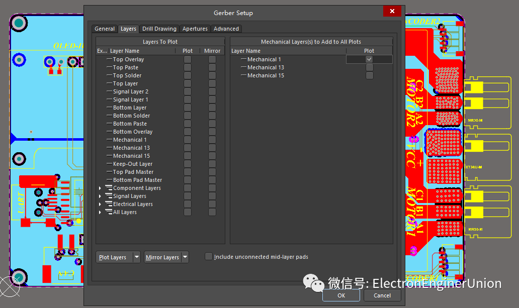 1、在PCB的文件環境中,再次file->Fabrication outputs->Gerber Files,進入Gerber Setup 界面,在"layers"里面,在左邊的"plots layers/mirror layers "均選為all off , "include unconnected mid-layer pads"前面的勾也去掉。只選中有關板子外框的機械層,點擊"OK"進行第二次輸出。設置如圖所示: