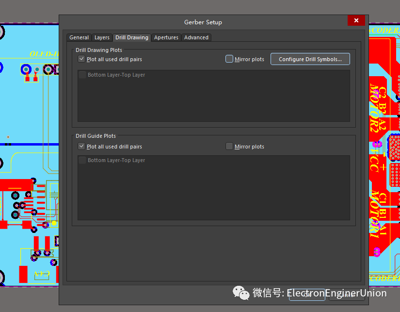 3、在"drill drawing"里面,選擇你要導出的層對,一般選擇"plot all used layer pairs","mirror plots"不用選中。Drill drawing plots和Drill guide plots做同樣的選擇。如下圖所示: