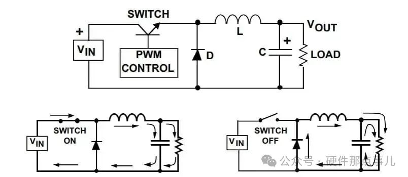 BUCK電路通常包括開關MOSFET、二極管、電感和電容。其工作過程分為兩個階段: