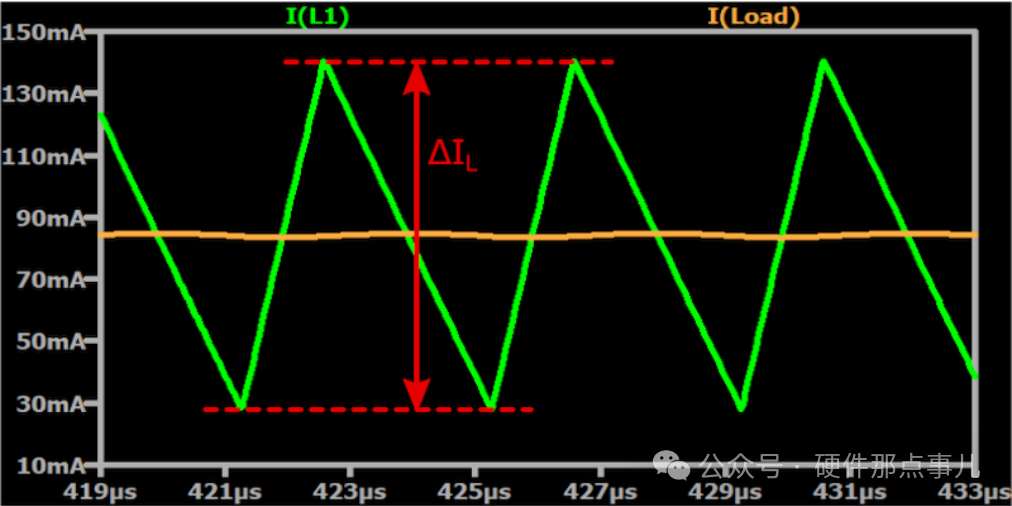 這是電感電流在直流分量上下波動的峰峰值,由開關過程中的充放電引起。