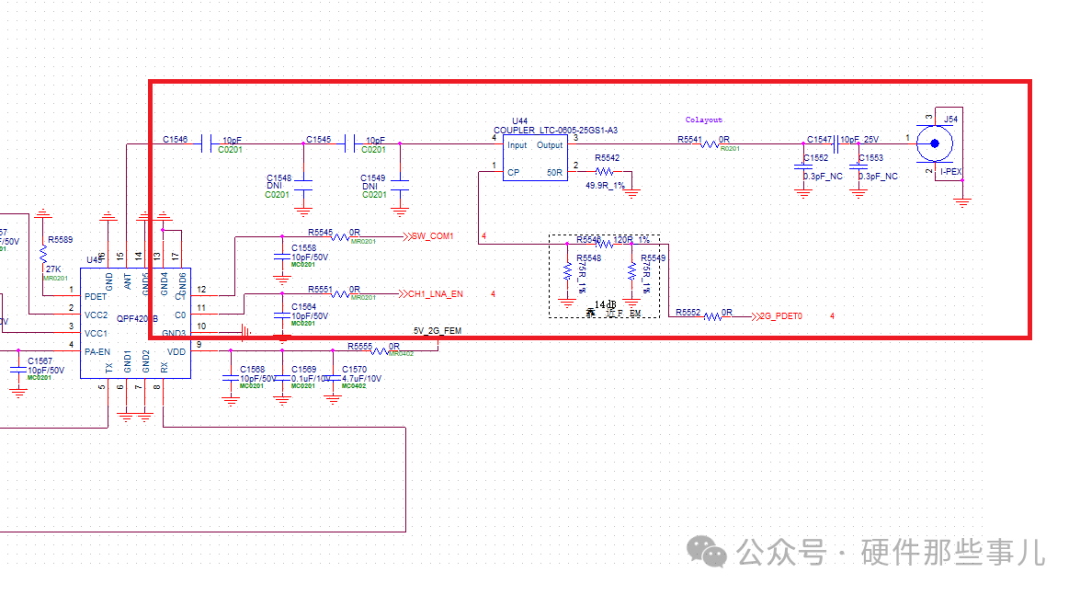 首先我們來看一下WIFI FEM的輸出電路圖結構,如下圖紅框所示: