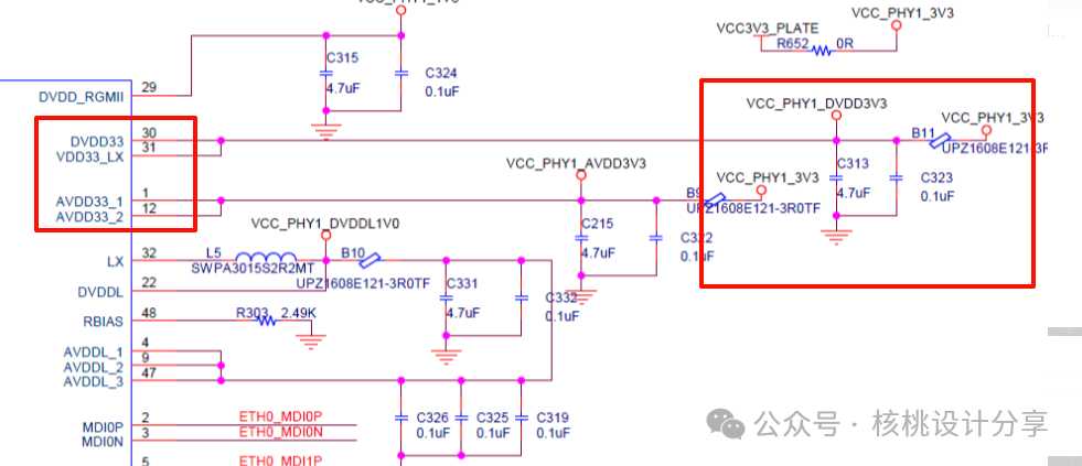 還有另一個電源,也是很多新手忽略的,RTL8211的核心電壓(核壓),就是AVDD,DVDD,如下圖所示,典型值為1.0V,而且紋波大小最好控制在100mV以內。