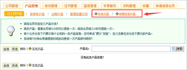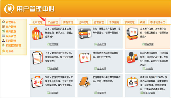 開通電源網在線商鋪后,點擊企業中心“產品管理”按鈕,您可以進行產品信息發布。