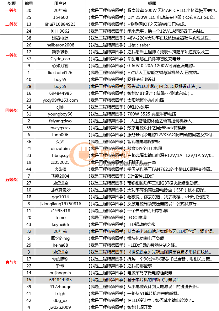 電源網論壇任意技術版區發布標題前綴“【我是工程師第四季】”的主題帖即視為參賽。帖子需為電源、逆變、感應加熱、單片機、充電樁等相關,內容可以是原創、DIY、經驗分享、拆機分享等,或者工程師職業生涯分享等。