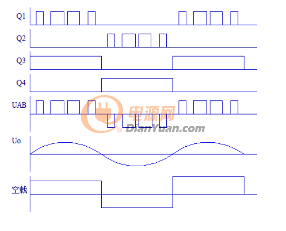 一種誤區:如果Q1-Q4的驅動時序如下圖,我們可以分析出,當正弦波正半波時Q1,Q3按正弦規律導通,負半波時Q2,Q4按正弦規律導通.最終A, B兩節點之間的波形如下圖的UAB;經過LC濾波后的輸出波形如下圖的Uo所示為正弦波。可是實際我們搭電路出來一試呢,發現空載時Uo為50Hz方波,帶載到一定程度才是正弦波,為什么呢?怎么改進呢?