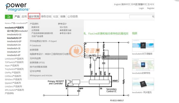 2、進入PI官網后,鼠標指針放到“設計支持”上面,分別點擊“數據手冊、應用指南、設計范例”尋找答案。如下圖所示