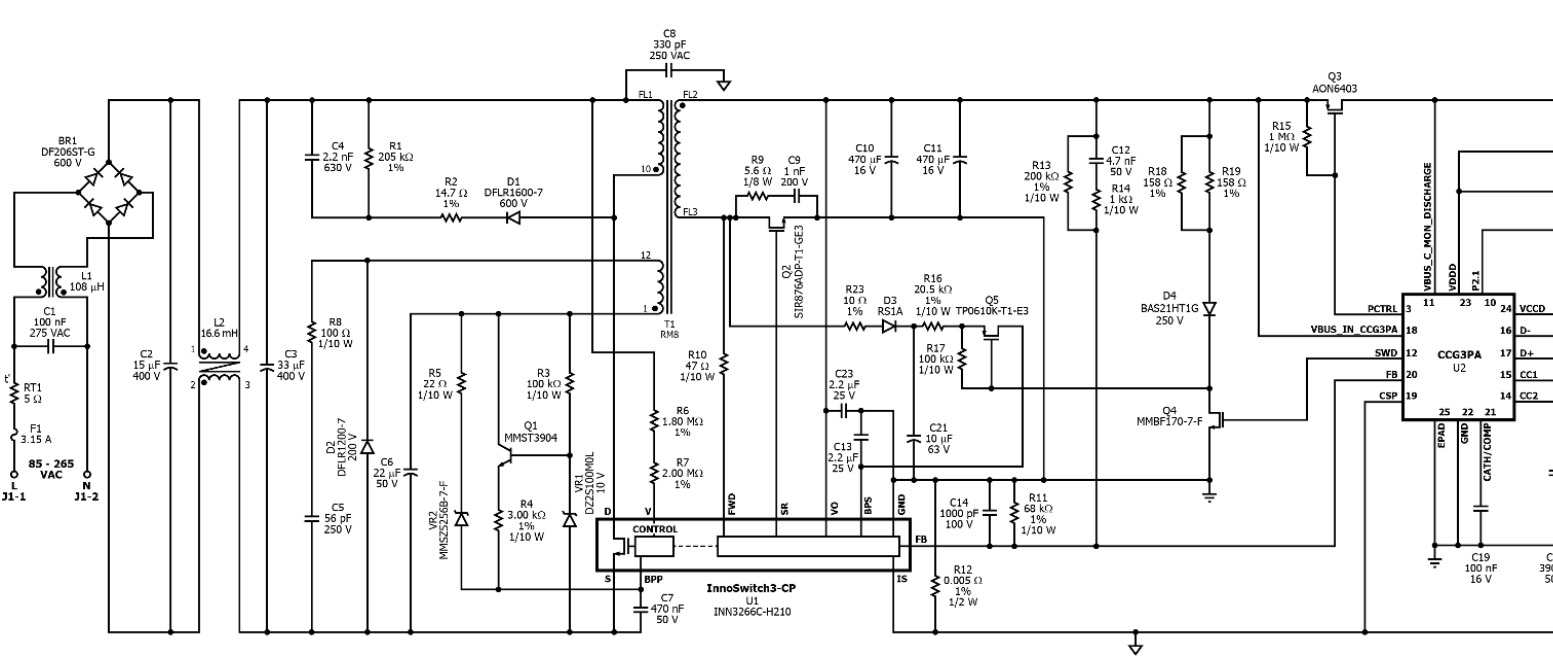 該電源為27W的USB PD電源的設計方案,可配置為5 V/3.0 A,9 V/3A或3~11V,電壓和電流可調,符合USB PD 3.0和PPS協議。該電源使用PI的InnoSwitch3-CP集成電源控制器的INN3266和賽普拉斯CYPD3175設計的USB PD控制器。由于InnoSwitch3-CP控制器的高集成度,該設計可提供高功率密度和高效率,從而提供卓越的性能。