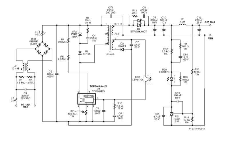 本方案采用TOP267EG 離線式開關 IC 設計的 50W 輔助備用工業電源,首先TOP267EG 核心優勢是集成 725V MOSFET、多模式 PWM 控制器、振蕩器及完備保護電路(過壓/過流/過熱),顯著減少外圍元件數量,eSIP-7C 立式封裝,占用 PCB 面積小,支持散熱片夾裝(熱阻等效 TO-220),適合緊湊工業機箱。