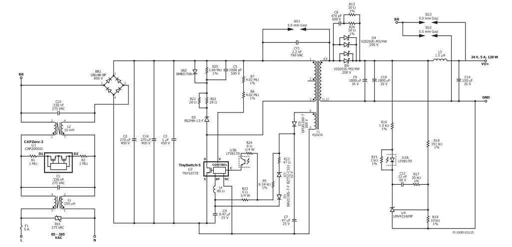 基于TinySwitch 5的工業應用120W隔離反激電源的設計,采用 TTNY5077E離線切換器IC, 該設計在85-265VAC寬輸入電壓范圍內可以提供24V/5A輸出,效率在115VAC時大于90%,230VAC時大于91%,空載功耗小于80mW。TinySwitch-5芯片本身的特性采用先進控制引擎自動調整開關頻率和功率輸出,最高效率可達92%,待機效率高(1%負載下效率最高87%),可滿足歐盟ErP規定的300mW待機功率要求。芯片有兩種封裝形式,表面貼裝封裝無需散熱片可提供高達75W輸出功率。