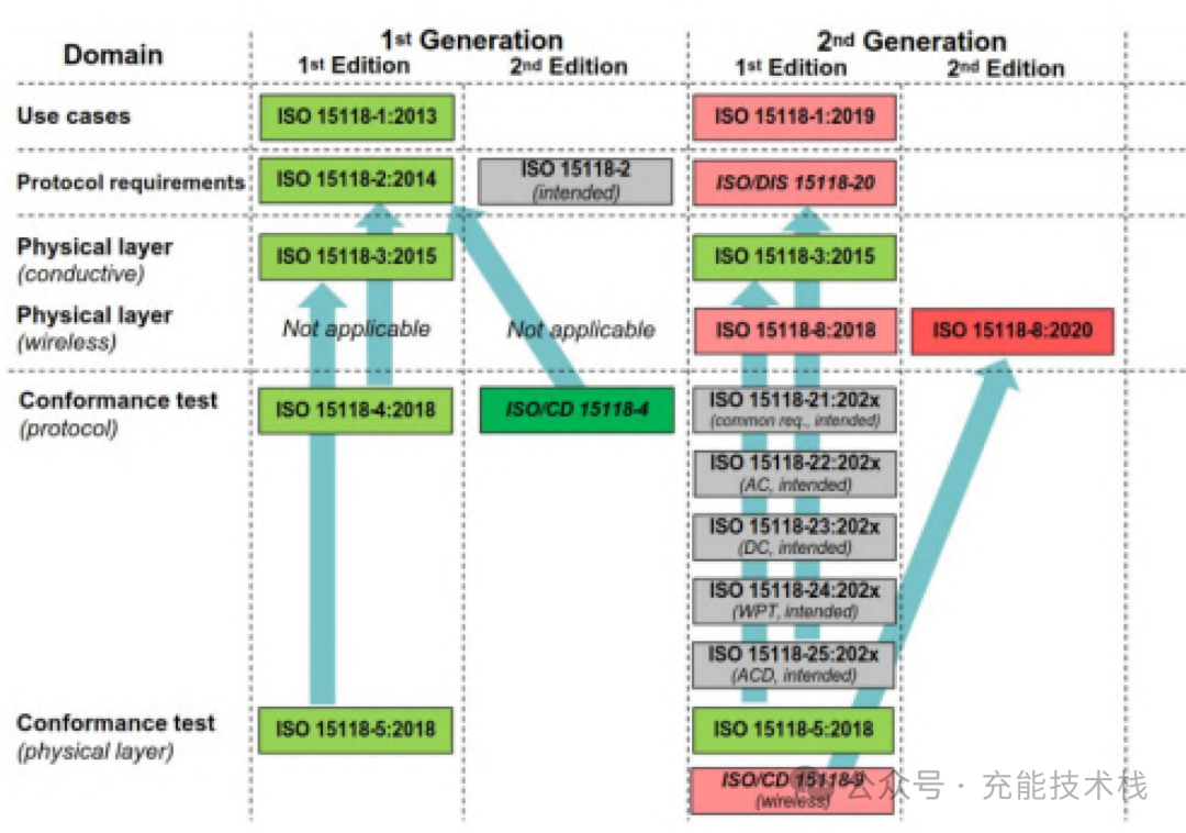 德國充電采用DIN SPEC70121標準,該標準規定了純電動車輛(BEV)或插電式混合動力電動車輛(PHEV)與電動汽車供電設備(EVSE,也稱為充電樁)之間特定的DC通信,DINSPEC70122是其對應的一致性測試的測試用例。ISO15118系列標準由ISO組織頒布制定,也同樣對通信協議方面進行了限定。與DINSPEC70121只涉及直流充電不同,ISO15118系列標準同樣適用交流充電,整個體系層次結構更加清晰完整.