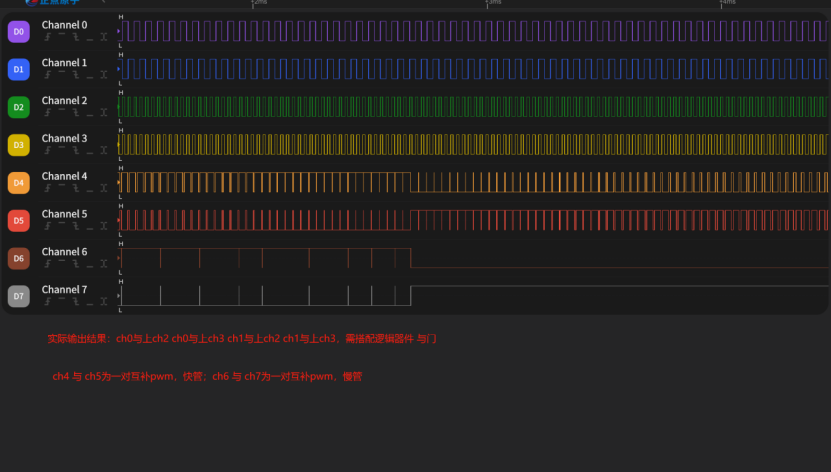 這里的(ch0 ch1) (ch4 ch5) (ch6 ch7)使用互補輸出可以插入死區時間,避免驅動交錯而器件的損壞。