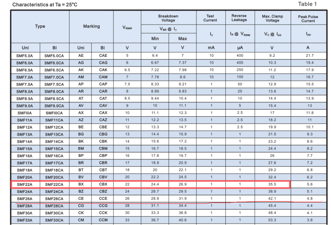 折中選擇,VRWM為22V(1.2倍)的TVS,鉗位電壓35.5V。
