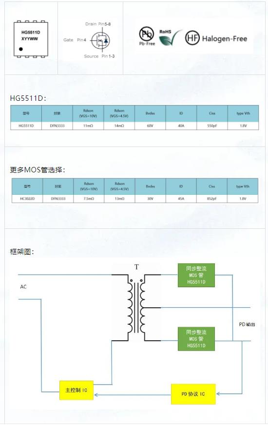 HG5511D參數特點【HG5511D】SGT工藝NMOS,高頻率大電流低內阻、小體積、低結電容,快充專用MOS管
