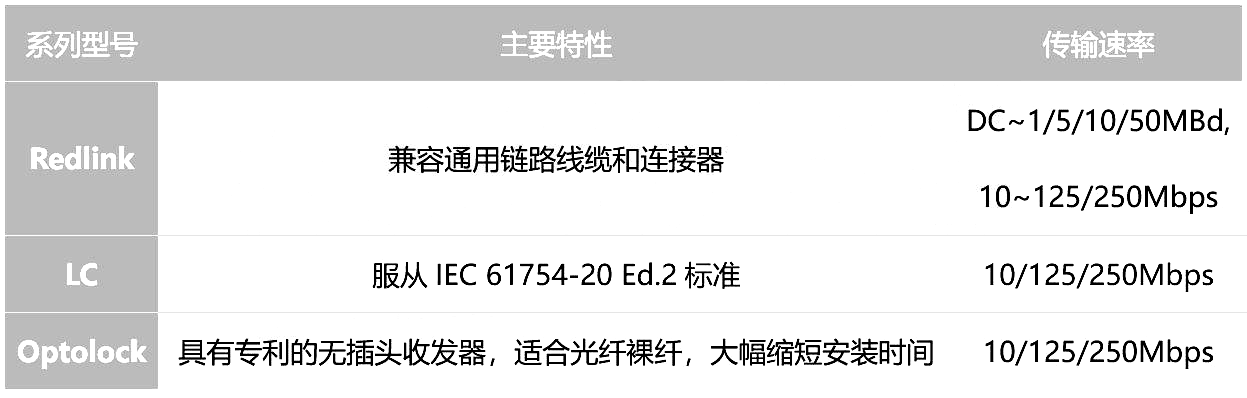 Firecomms有三大系列的光纖收發器(Redlink,LC,Optolock),各系列的主要特性及數據傳輸速率如表1所示。