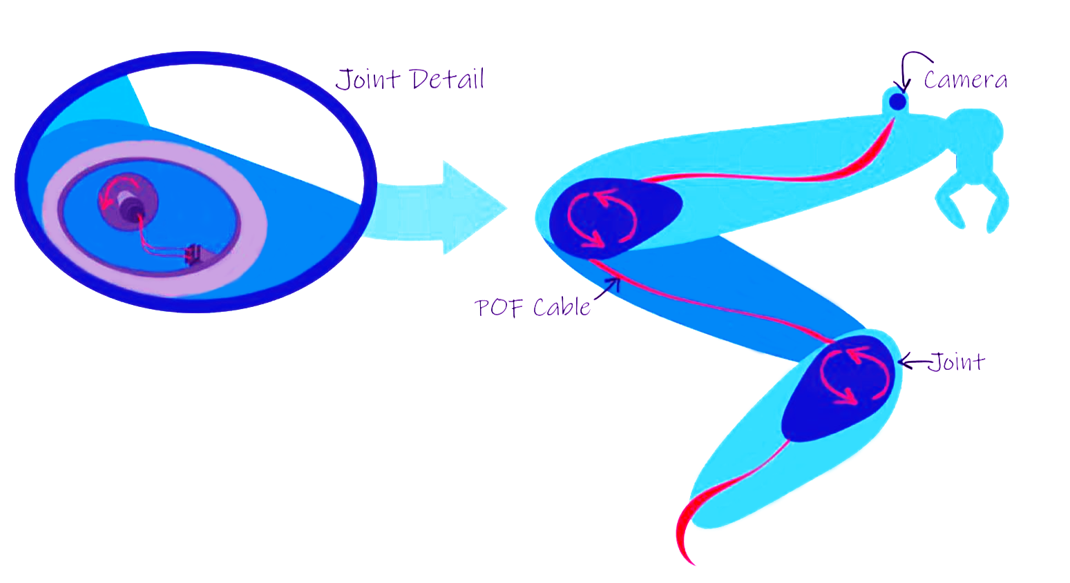 相比之下,Firecomms的塑料光纖兼具十分出色的靈活性和耐用性,其在承受超2500萬次的扭轉和彎曲后性能仍未出現可觀測的下降,并且塑料光纖成本低廉,十分適合工業機器人應用。同時,由于采用光波作為信號載波,因此不存在EMI干擾的問題,可與電源線整合布線。