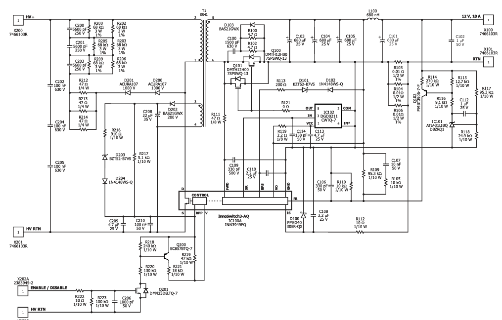 電源采用反激式轉換器拓撲,可從高壓輸入提供隔離式低壓輸出。反激平面變壓器T1的原邊繞組連接在高壓直流輸入與InnoSwitch3-AQ集成電路(IC100)內部1700V SiC功率開關的漏極引腳之間。