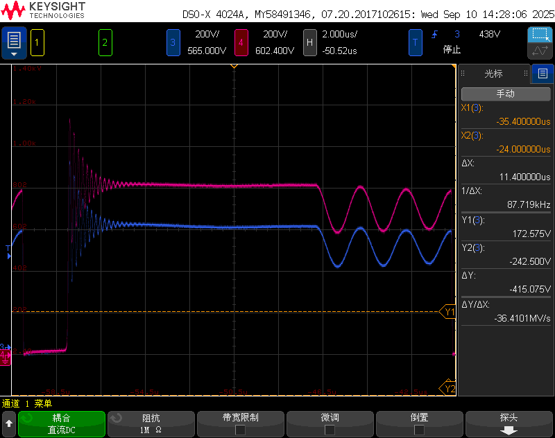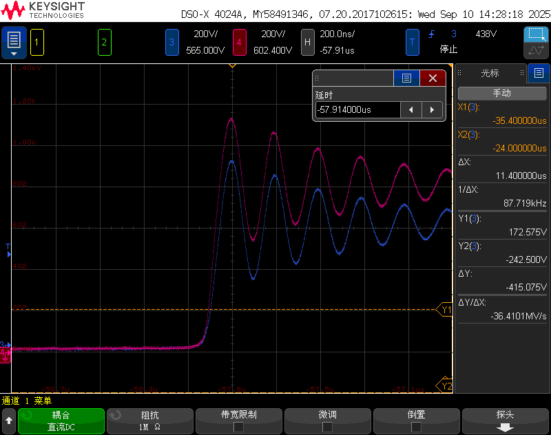 圖1紅色是下管DS關斷時波形,藍色是上管DS關斷波形,關斷時都沒有鉗位到母線,而且還是震蕩的,兩管電壓相差200V。