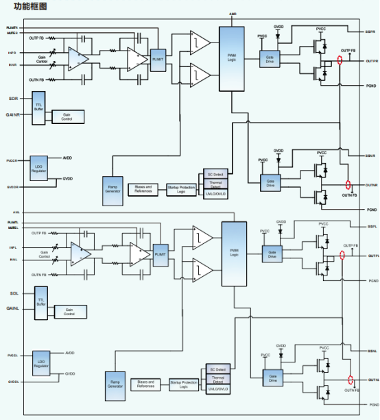 電氣性能上,該芯片支持 5V~36V 寬電源電壓輸入,45V 耐壓設計提升可靠性,92% 高效性能(PVCC=15V、PO=2X20W 條件下)降低功耗損耗;內置過流、短路、過熱三重保護,過熱保護觸發溫度 170℃,降溫 20℃后可自動恢復,短路故障排除后 110ms 內自恢復,減少硬件故障風險。