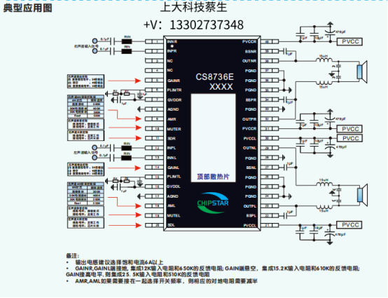設計靈活性方面,CS8736E 提供三段增益可選(GAIN 端接地 / 懸空 / 接高電平對應 54 倍 / 40 倍 / 20 倍放大,集成對應輸入與反饋電阻),AMR/AML 管腳可通過不同接地方式選擇 270kHz-600kHz 開關頻率以實現 AM 抑制;PCB 設計時需注意大電流路徑(VIN→PVCC→GND)粗短走線、露銅加錫,供電腳就近貼 10μF 與 1μF 陶瓷電容,推薦搭配 470μF 電解電容,所有 GND 就近接大面積銅箔減小阻抗,進一步保障電路穩定性。