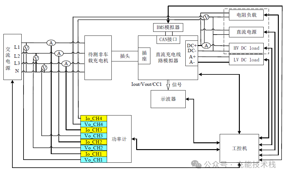 電氣原理圖,主要包括三個部分:非車載充電機、車輛接口、電動汽車。直流充電線路模擬器主要是車輛接口電路的部分。主要是模擬正常情況、接口的接觸不良、接口的異常短路、CC1/CC2 電壓異常、R4/R5 阻值異常等情況。故障模擬的測試項目包括模擬PE 針斷線故障測試、通信中斷測試、車輛接口斷開測試、公差外電阻測試、電阻邊界測試等。直流充電樁的槍頭信號為電動汽車線路模擬主板的輸入的端口。