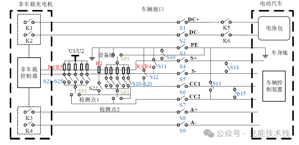 從直流充電控制線路設計圖分析可知,S1-S9 模擬各個接口接觸不良;S10-S13 模擬各個接口與地短路異常;S14 模擬S+、S-信號短路異常;S15 模擬CC1、CC2 控制信號短路異常;S16-S18 模擬檢測點1 及監測點2 在不同電壓下充電動作情況;S19-S21 模擬R3 及R4 在不同阻值情況下樁或車的充電動作情況;SP1、SP2、SP3 控制電動汽車、直流充電機兩種模式切換。