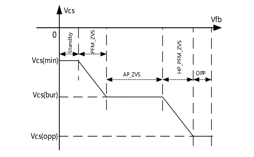 在極輕載,為了實現開關損耗和導通損耗平衡,提高極輕載效率,芯片根據Vcs 大小,控制器還是固定開通兩個周期,Vcs 閾值從 160mv-300mV 調節。Vcs 增加,工作頻率降低;