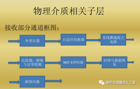 3. 物理介質相關子層(PMD)主要實現數據流擾碼器/解擾器,MLT-3(三電平雙極性編碼+V,0和-V)編碼/譯碼,直流恢復(MLT-3編碼中會出現連0或者連1,從而產生直流分量,變壓器隔直會引起信號基線的漂移),自適應均衡器,雙絞線對發射機,雙絞線對接收機,自動極性校正與隔離變壓器。