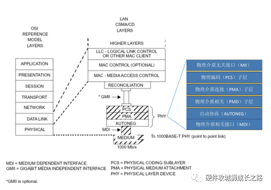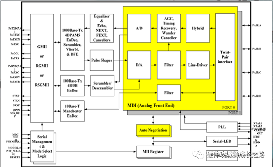 今天我們聊聊以太網的物理器件PHY,首先我們看看PHY的器件構成,以太網的物理層包括4個功能層和兩個接口層,接口層MII和MDI已經在前面的文章做過分享,這里就不再做贅述。今天我們主要聊聊PHY的4個功能層。即物理編碼子層PCS(Physical Coding Sublayer),物理介質連接子層PMA(Physical Medium Attachment),物理介質相關子層PMD(Physical Medium Dependent)以及自動協商Auto-Negotiation。