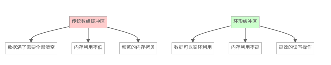 普通緩沖區: 滿了就無法寫入,需要手動管理空間,容易丟失數據。