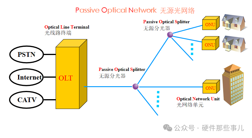 PON由OLT(Optical Line Terminal)、 ONU( Optical Network Unit)和無源分光器組成;