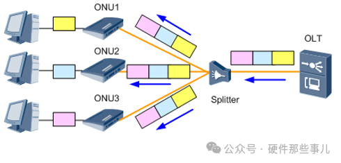 所有數據從OLT端廣播到所有的ONU上,下行數據幀采用固定長度125us,所有ONU都能收到OLT下發的所有數據,通過Gemport ID來說識別區分自身的數據流,丟掉非自己的數據。
