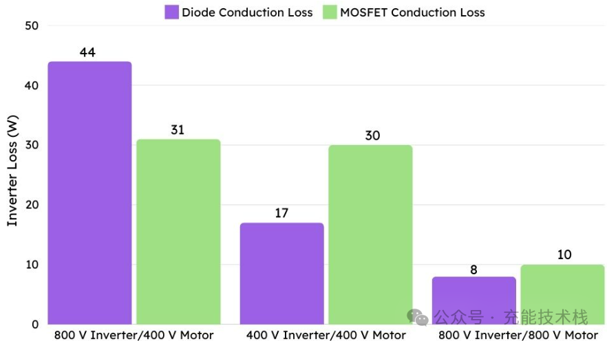 當800V OBC連接到120或240V電網時,交流/直流轉換器級中的二極管橋的額定值必須能夠處理增加的電壓。與400V OBC相比,二極管橋所需的額定電壓加倍。然而,即使二極管橋的期望額定電壓增加,也不意味著損耗增加。
