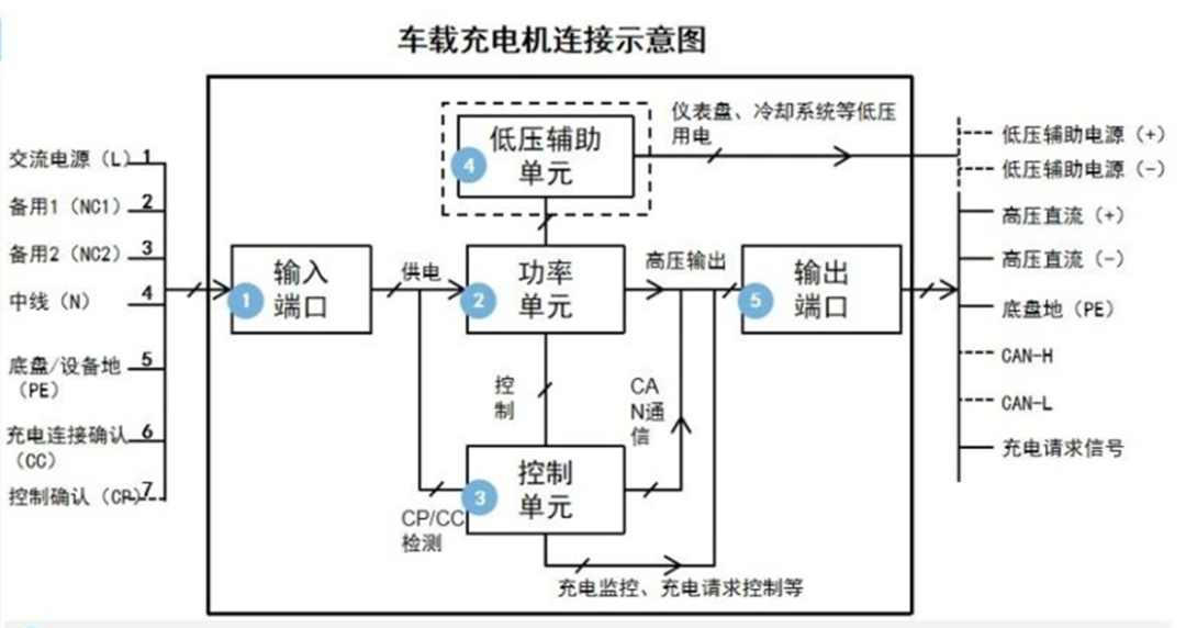 根據結構分類,車載OBC可分為單向、雙向和集成式車載OBC。單向車載OBC只能給動力電池充電,雙向車載OBC可以把動力電池的直流電逆變成為家用220V交流電,遇上停電期車可作為家庭應急電源使用。車載充電機在電動汽車中扮演著重要的角色,具備多種功能,其中最重要的是與BMS(電池管理系統)和車輛監控系統進行通信。通過高速網絡CAN與BMS進行交互,能夠根據BMS的指令動態輸出最適合動力電池狀態的電流和電壓參數,為電池組選擇最優的充電模式。在充電過程,BMS主要監測動力電池組電壓、電流、溫度和連接狀態等信息,以控制和保護電池。通過高速CAN網絡與車輛監控系統通信,上傳自己的工作狀態、工作參數和故障告警信息,并接受啟動充電或停止充電的控制命令。此外,還具有完備的安全防護功能。例如交流輸入過壓保護、交流輸入欠壓告警、交流輸入過流保護、直流輸出過流保護、直流輸出短路保護、輸出軟啟動、防止電流沖擊、阻燃等。這些功能在充電過程中保護電池,防止過熱、過充和短路等危險情況的發生,確保電池的安全和穩定運行。車載OBC由多個部分組成,其中包括交流輸入端口、功率單元、控制單元、低壓輔助單元和直流輸出端口。