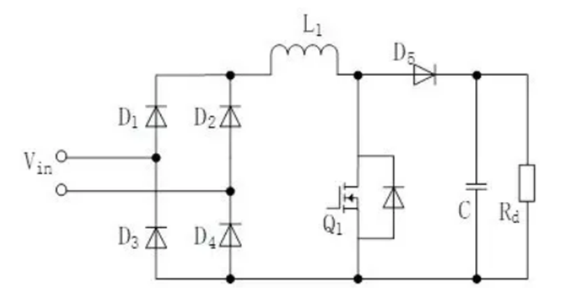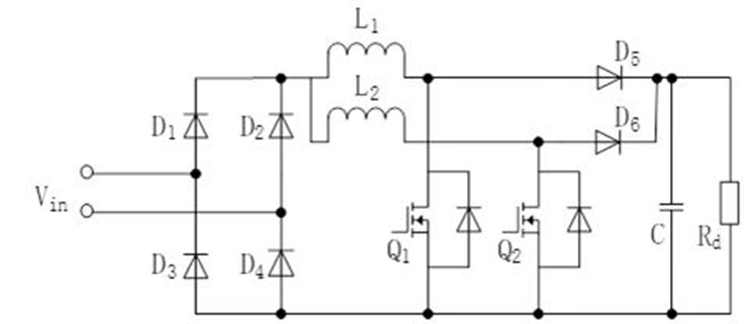傳統有橋Boost PFC:當Q1導通時,正半周期導通路徑為D1、L1、Q1、D4,負半周期導通路徑為D2、L1、Q1、D3;當Q1關斷時,正半周期導通路徑為D1、L1、D5、Rd、D4,負半周期導通路徑為D2、L1、D5、Rd、D3。