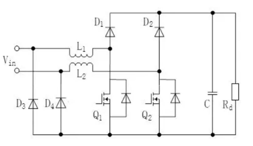 在每個狀態下,導通開關器件的數量均為3個,其優勢在于電路拓撲好控制都很簡單,但是僅存在一個Q1開關器件,其電壓、電流應力非常大,很難用于大功率場合。交錯并聯Boost PFC:由兩個相同的Boost PFC變換器并聯而成,該拓撲電路可以使得PFC的電感減少。通過控制兩個功率電感電流交錯180°反相,可降低輸入輸出的電流紋波,減少EMI濾波器的體積。