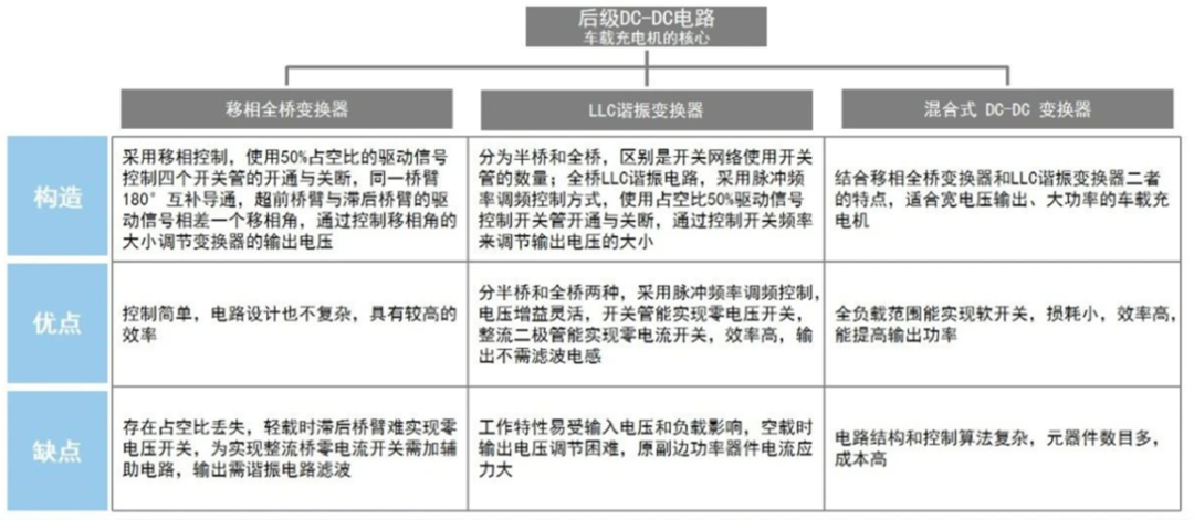 車載OBC一般采用兩級架構,前級PFC主要負責功率因數校正,一般輸出400V直流電。后級DC/DC電路從PFC母線取電,實現隔離和調壓功能。由于DC/DC所接負載為電池,一般輸出200-500V的高壓直流電,故后級必須采用高效率寬范圍的隔離DC/DC拓撲結構。