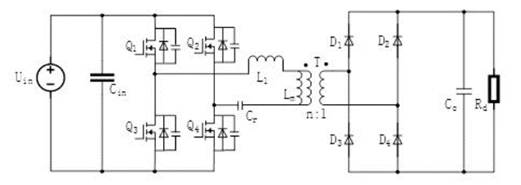 移相全橋電路:可以實現最低零電壓的寬范圍電壓輸出,其超前臂Q1Q3的驅動信號有著180°的相位差,滯后臂Q2Q4的驅動信號分別與Q1Q3滯后一定相位,控制驅動信號之間的相位角不同,可以使得變壓器漏感和開關管結電容進行諧振,開關管的軟開關得以實現。