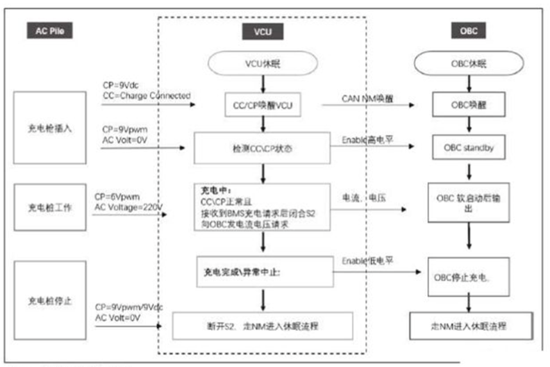 上、下電邏輯如下:CP喚醒VCU后,VCU通過CAN喚醒OBC,VCU檢測CC和CP的狀態正常后閉合S2,此時充電樁輸出交流220V,VCU給出OBC功率控制高電平,OBC根據VCU給出的電壓、電流請求正常輸出。當充電完成或是充電故障,VCU拉低功率使能信號,OBC停止輸出,之后整車走休眠流程,具體流程圖參見下圖所示