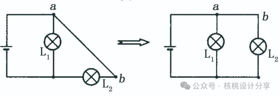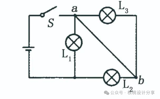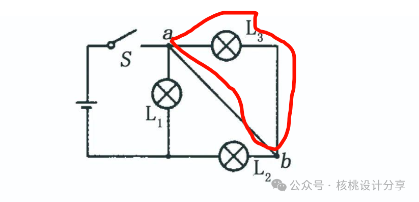 從上面中,我們可以看得出來L3是被a和b之間的導線給短路了。
