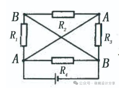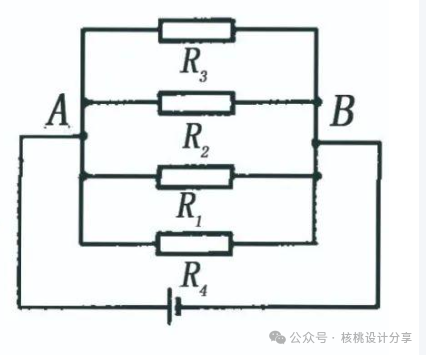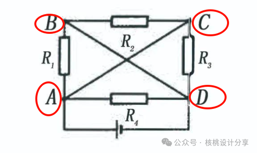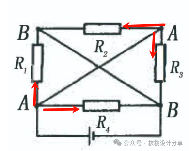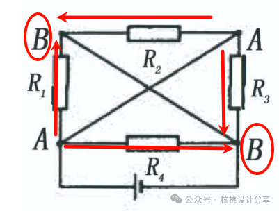 那同理,A點出發后經過電阻R1,R2,R3,R4后是不是都回到了B節點,走向如下所示: