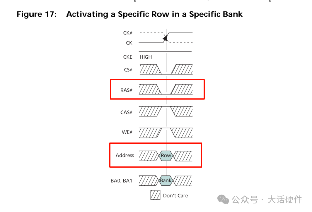 從時序圖可以看出,地址線上是行地地址時,有效的是RAS# 信號,其中的# 表示低電平有效。地址線上是列地址時,有效的是CAS# 信號。