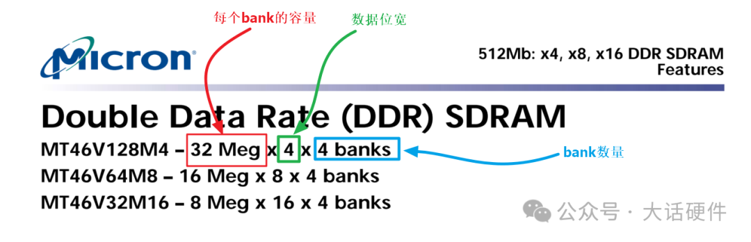 針對MT46V型號,容量為512Mb的DDR,它有三種位寬,分別是x4 x8 x16,內部為4bank。