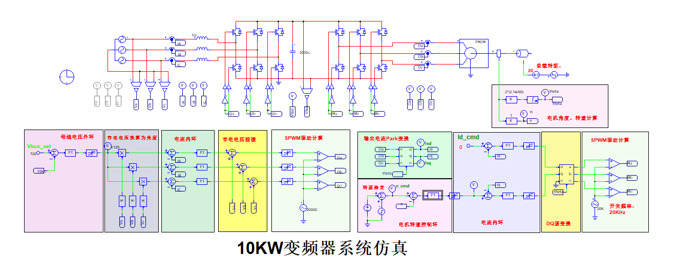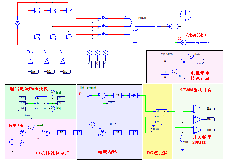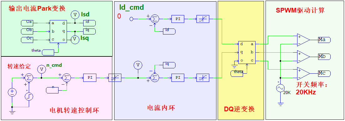 內環為電流環:快速跟蹤Id_ref(通常設為0以維持額定磁通)和Iq_ref,通過PI調節器和前饋解耦計算,輸出控制電壓,經SPWM驅動逆變器,從而精確控制電機轉速和轉矩。