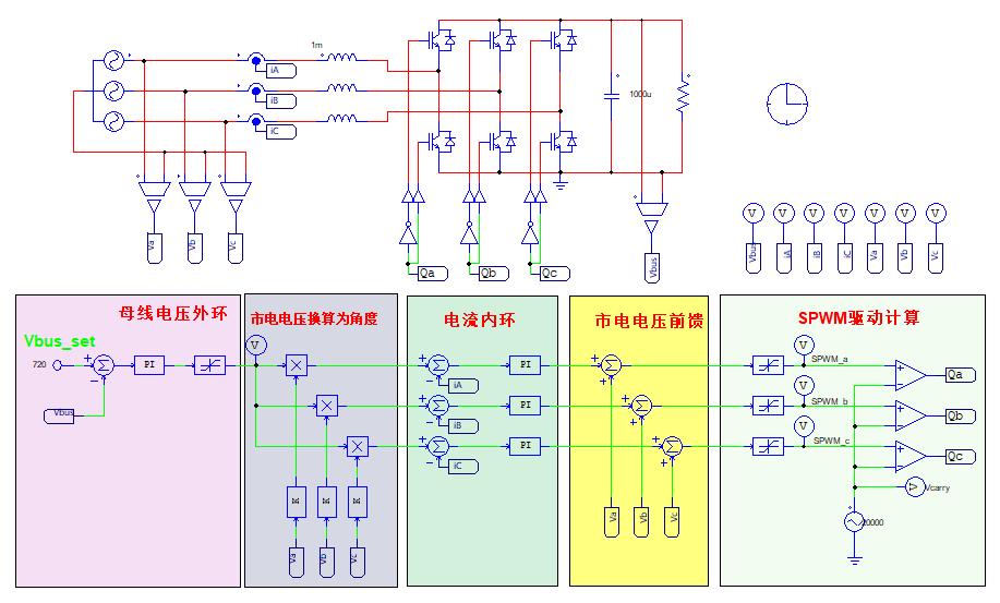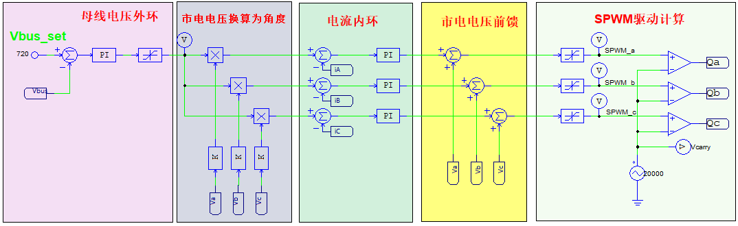 - 整流雙環控制:整流器雙環控制的核心目標是控制輸入電流并穩定直流母線電壓,雙環控制兼顧了輸入電流的高輸入功率因數與低諧波失真,又保證了母線電壓的快速響應。