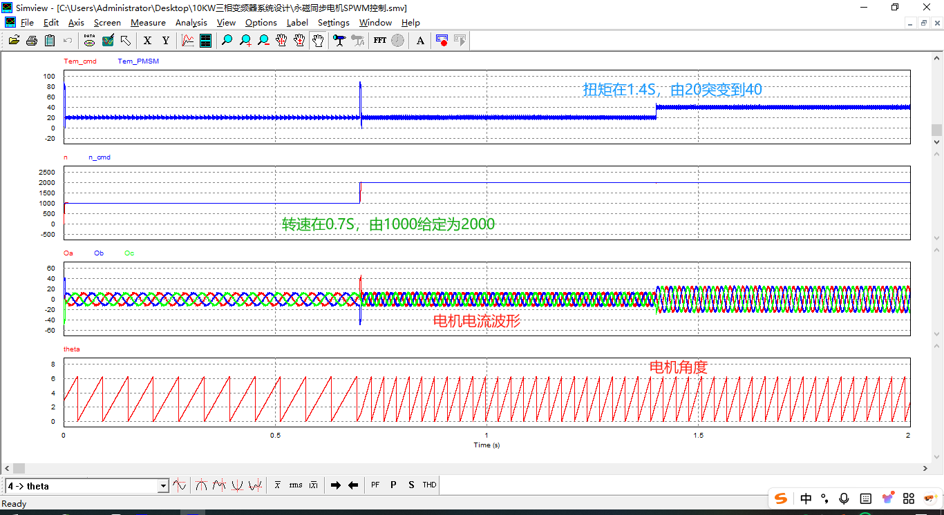 搭建完整的FOC控制系統仿真模型。測試結果顯示:電機初始負載扭矩20N·m轉速1000; 0.7s時轉速給定變為2000,1.4s時扭矩負載變為40N·m;整個負載變換過程中, 電機動態響應迅速,過渡平滑。